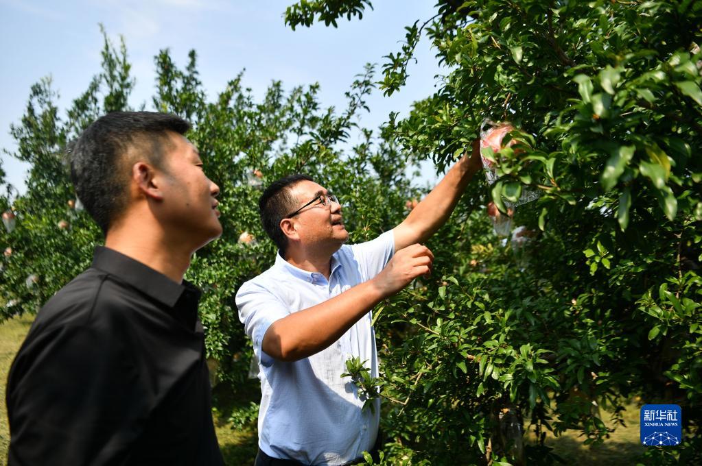 陜西省西安市臨潼區(qū)園藝工作站工作人員(右)與當(dāng)?shù)厥穹N植大戶交流果品長勢(2022年9月26日攝)。新華社記者 張博文 攝