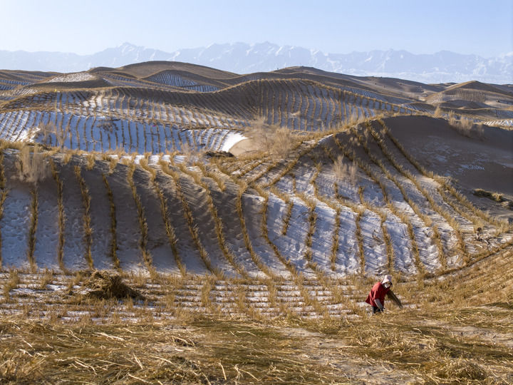 施工人員在甘肅省酒泉市阿克塞哈薩克族自治縣的庫姆塔格沙漠鋪設(shè)沙障(2025年12月13日攝,無人機照片)。新華社發(fā)(高宏善攝)