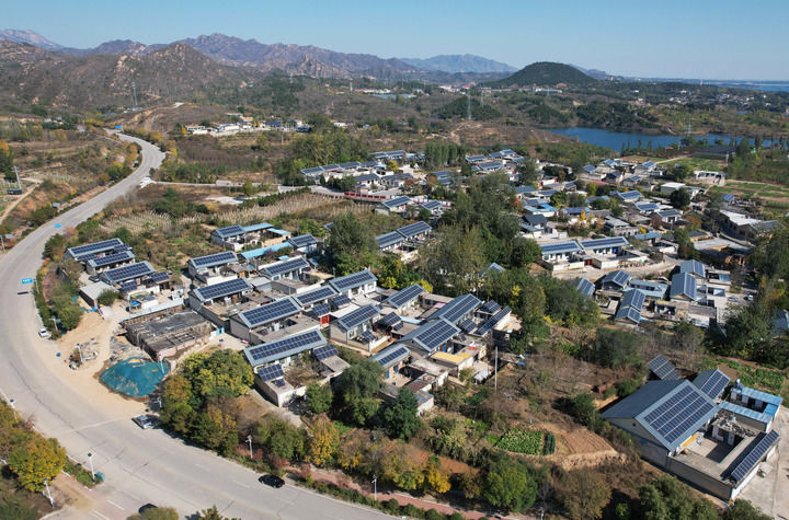 河北省平山縣西柏坡鎮(zhèn)北莊村兆瓦級“光儲”智能微電網(wǎng)示范工程項目中的屋頂光伏發(fā)電板(2025年11月2日攝,無人機照片)。新華社記者 楊世堯 攝