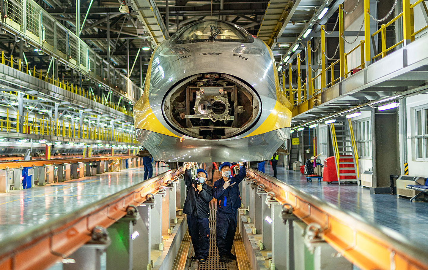 2月7日,中國鐵路鄭州局集團(tuán)有限公司鄭州動(dòng)車段動(dòng)車組機(jī)械師對(duì)綜合檢測列車進(jìn)行檢查