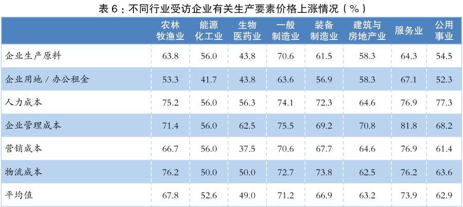 其六,各行業(yè)生產(chǎn)要素成本上漲壓力普遍較大,各生產(chǎn)要素價格上漲大多不超過30%。(見表6)