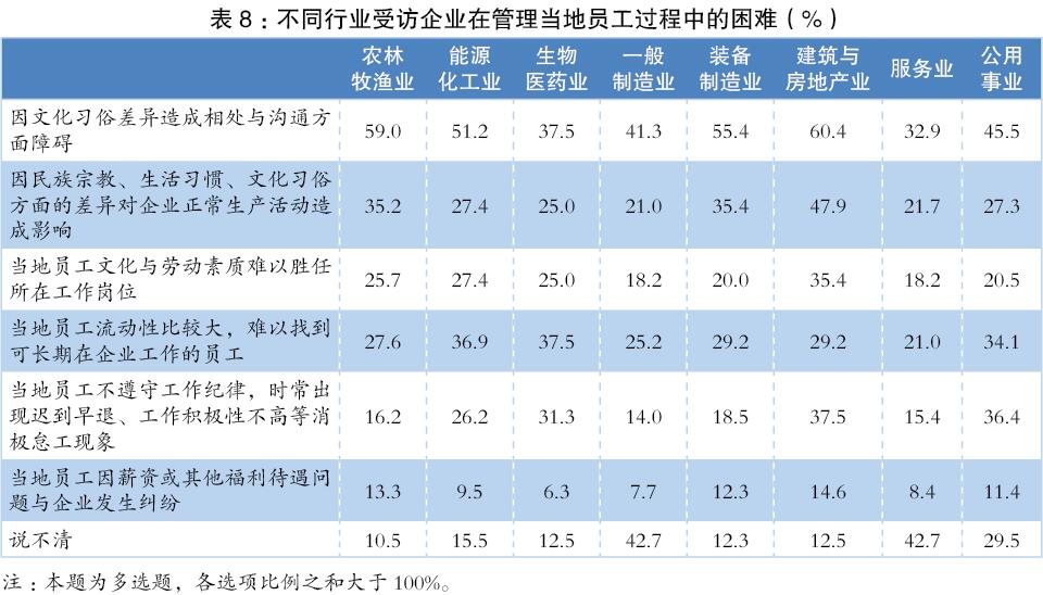 其八,跨文化溝通障礙與員工管理困難是各行業(yè)都面臨的難題,建筑與房地產(chǎn)業(yè)尤甚。(見表8)