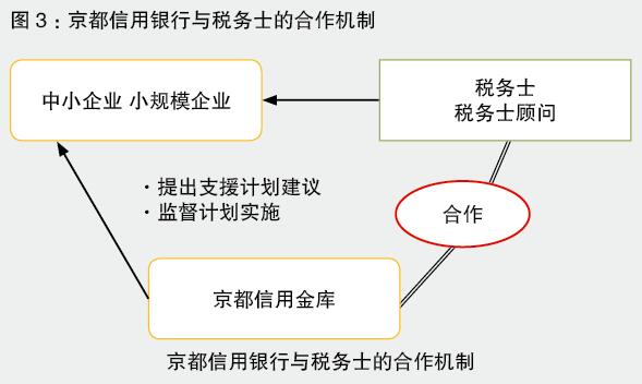 從2012年8月開始,日本政府實施“認定中小企業(yè)經(jīng)營革新支援機關(guān)”制度:由經(jīng)濟產(chǎn)業(yè)省通過接受申報,主持考試、審查認證,授權(quán)從事中小企業(yè)經(jīng)營革新的支援機構(gòu)。到目前為止已認定授權(quán)了約2.5萬個中小企業(yè)支援機構(gòu)。它由五類機構(gòu)組成:第一類是商工會、商工會議所、中小企業(yè)團體中央會等商會團體;第二類是稅務(wù)、法務(wù)類支援機構(gòu),主要是稅務(wù)士、會計士、咨詢顧問等專業(yè)咨詢機構(gòu)和專家;第三類是金融機構(gòu);第四類是一些財團法人、社團法人、NPO法人機構(gòu);第五類是其他中小企業(yè)支援機構(gòu)(主要是市町村自治體舉辦的中小企業(yè)支援中心)。通過這些支援機構(gòu)對中小微企業(yè)的免費或有償(政府補貼)輔導(dǎo)、咨詢、支援,提高中小企業(yè)的管理水平,規(guī)范其財務(wù)制度和信息透明制度,盡可能把金融機構(gòu)與中小微企業(yè)之間的信息不對稱降到最低。其中商會組織(商工會議所、商工會)的作用特別明顯,日本政府通過財政補貼,賦予商會對中小微企業(yè)的管理輔導(dǎo)特別是財務(wù)指導(dǎo)的職能,在此基礎(chǔ)上又賦予向金融機構(gòu)推薦融資的職能(見圖2)。比如,日本政策金融公庫有一項專門支持困難企業(yè)改善管理的專項貸款,其前提就是申請貸款的企業(yè)必須至少接受過商會六個月的管理指導(dǎo)。此外,許多商業(yè)銀行在向中小微企業(yè)發(fā)放貸款時常常與相關(guān)會計士、稅務(wù)士等合作,在發(fā)放貸款前,會同這些支援機構(gòu)與申請貸款的企業(yè)共同協(xié)商,并委托參與的支援機構(gòu)負責(zé)對貸款企業(yè)進行財務(wù)監(jiān)督(見圖3)。
